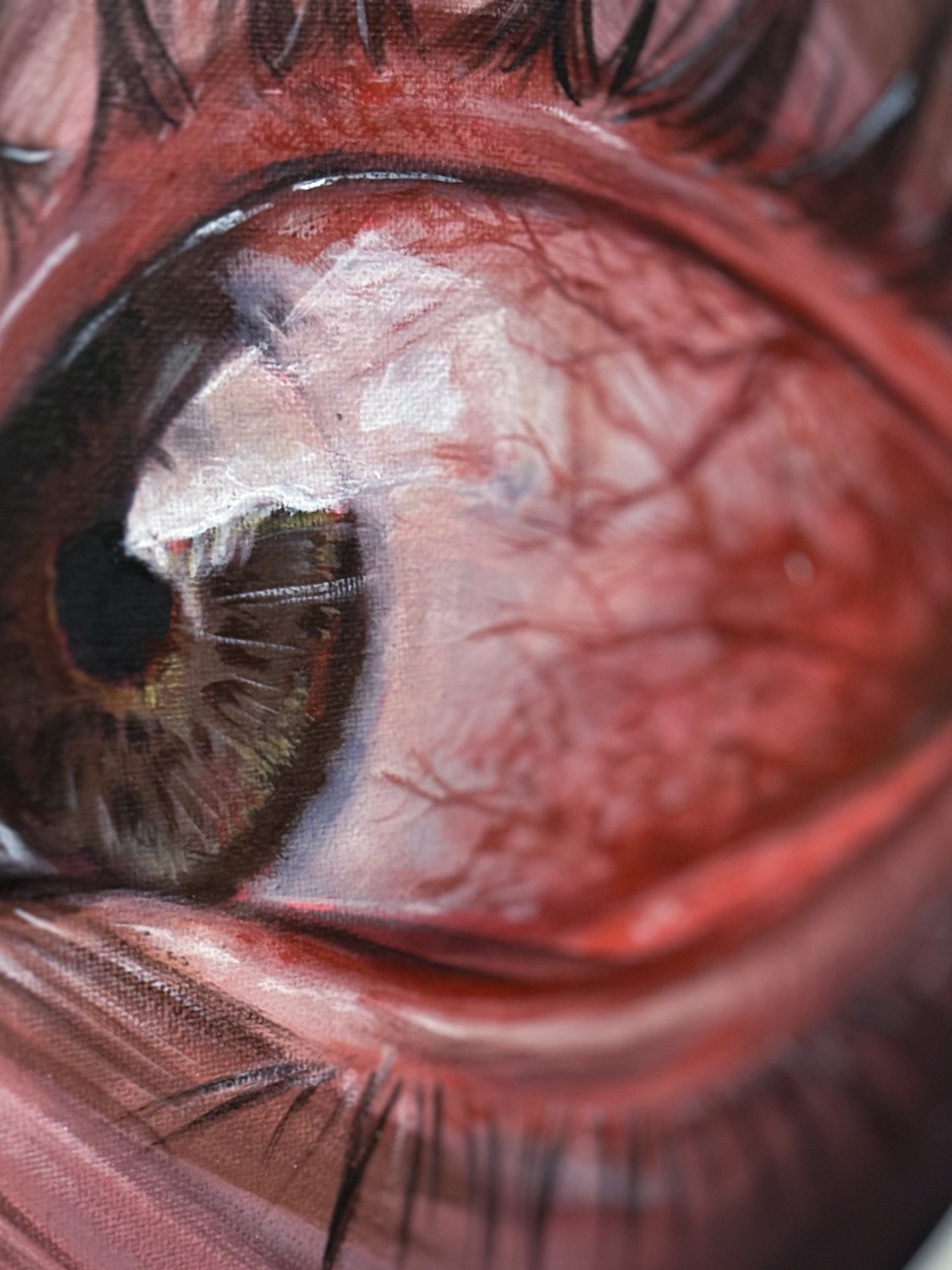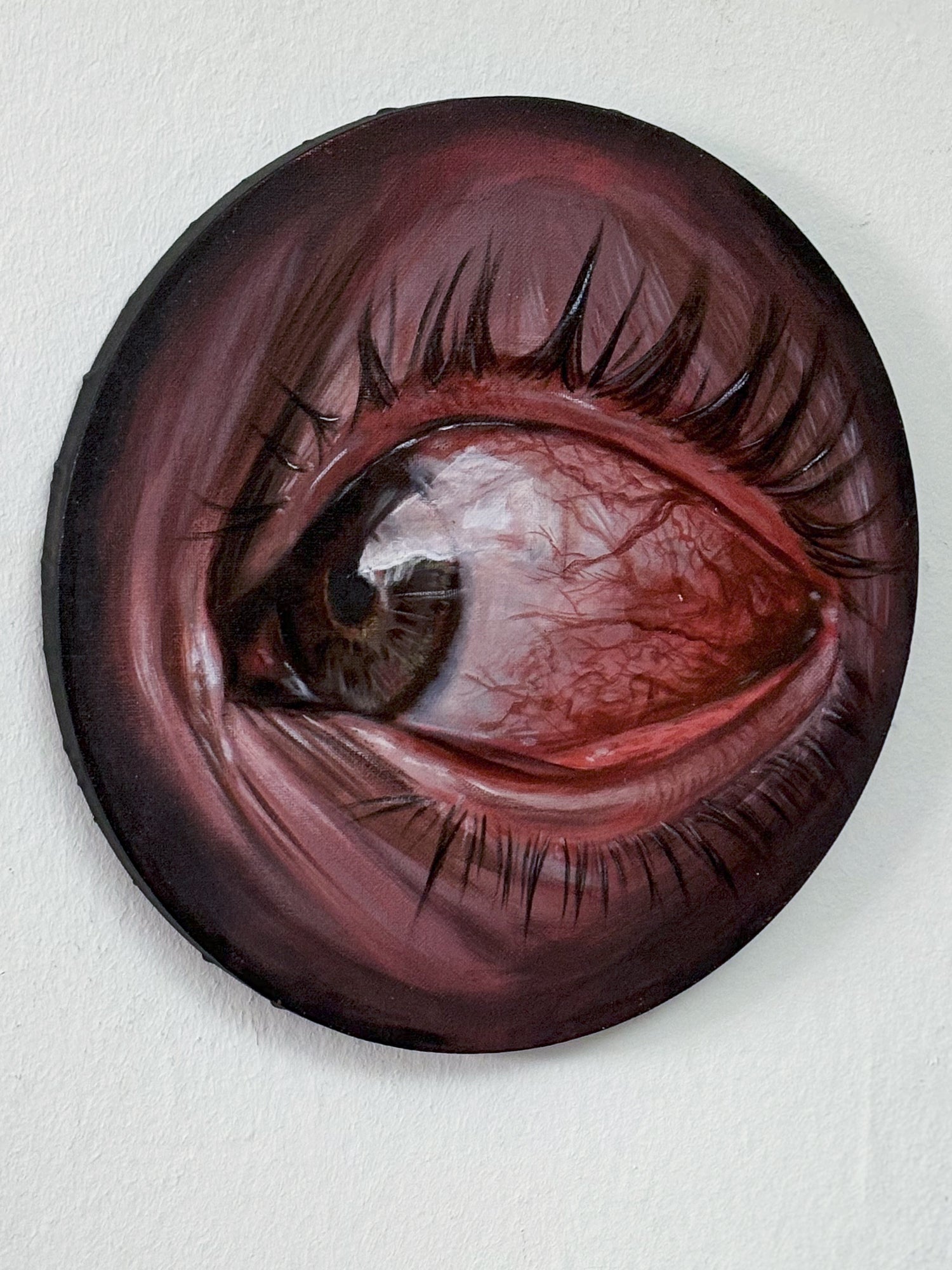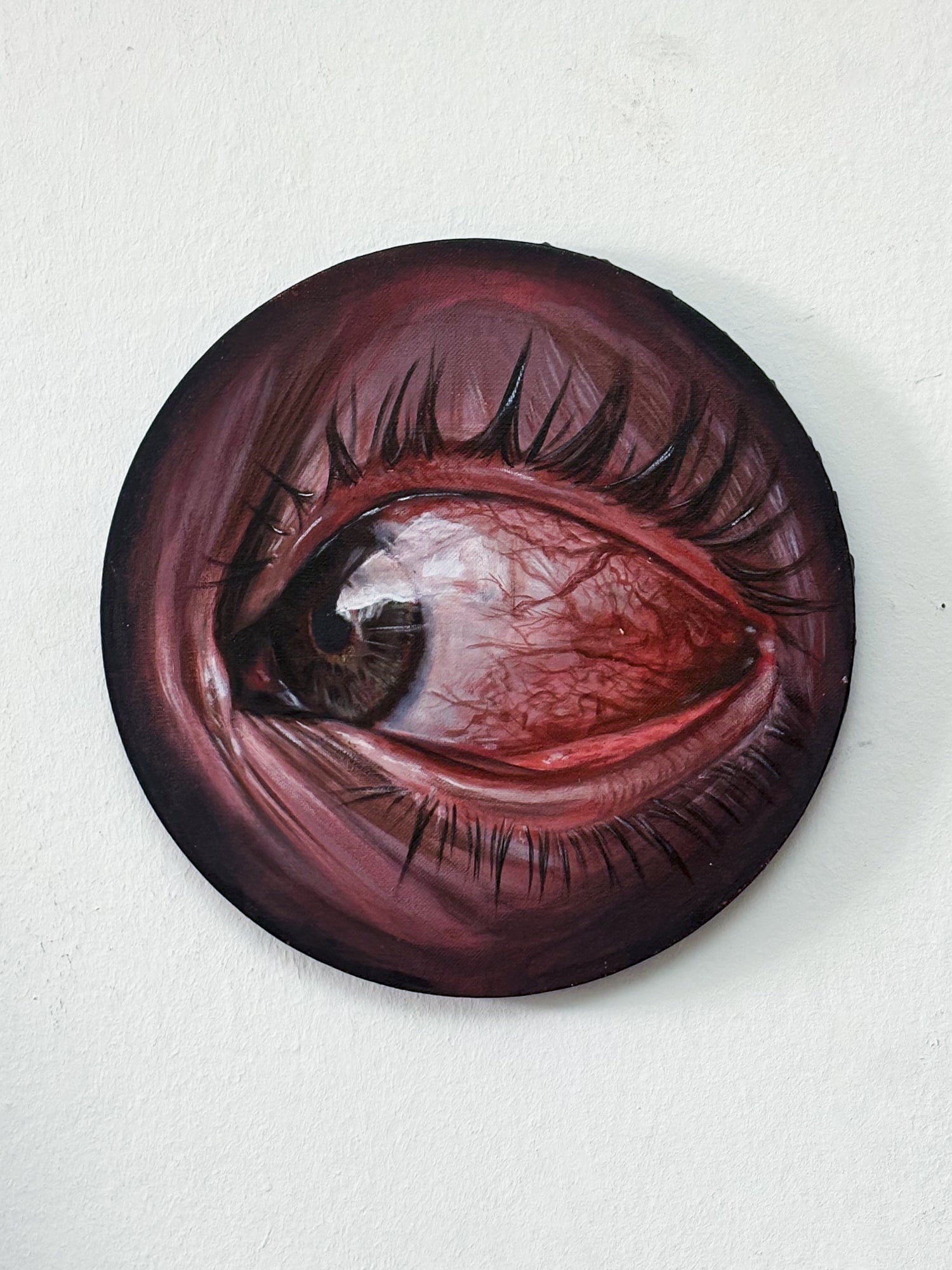 The Sight for Sore Eyes Collection featuring oversized reddened eyes, makes them appear intense and approachable, at times even unsettling. It addresses themes such as vulnerability, emotional openness, and a love for detail.